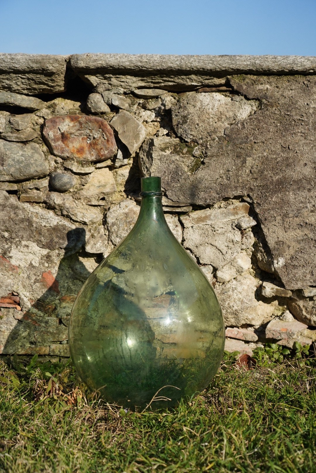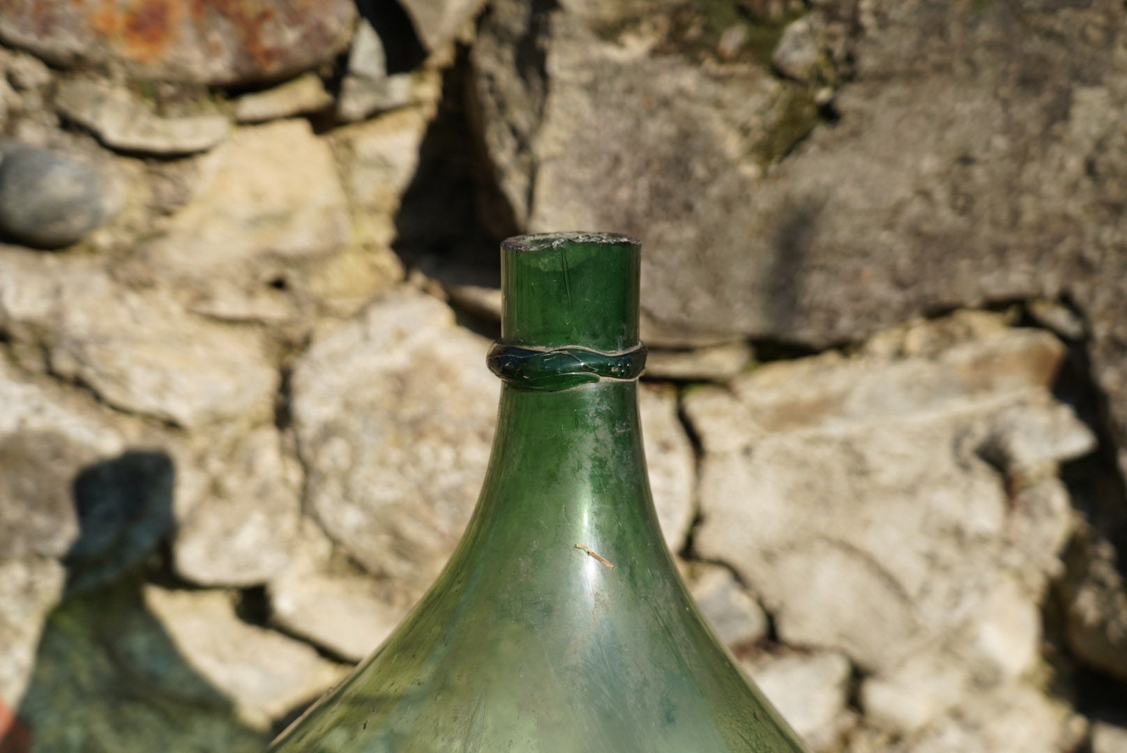 Damigiana in vetro soffiato, color verde, molto bella per la sua forma irregolare data proprio dal fatto che stata interamente fatta a mano con la tecnica del vetro soffiato.